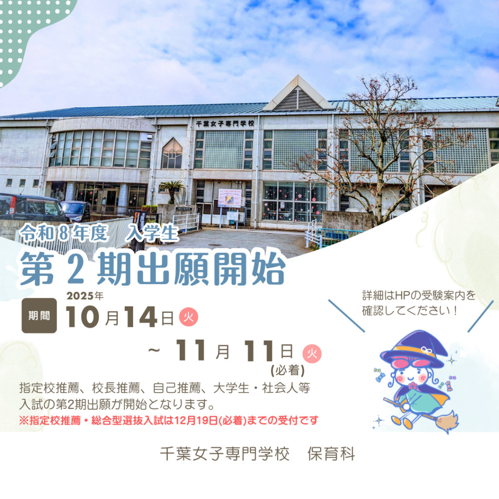令和8年度入学生 第2期出願の開始について 2025/10/8 入試, 受験, 受験案内 令和7年10月14日(火)より、 校長推薦、自己推薦、大学生・社会人等入試の第2期出願が開始となります。 指定校推薦の出願期間は12月19日(金)必着です。 詳しくはこちらをご覧ください。 問い合わせ先: TEL 043-226-1525 午前9時から午後4時30分まで(土曜日、日曜日、祝日以外)